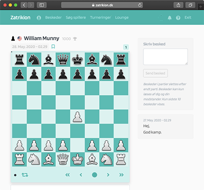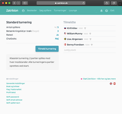 Hyggelig korrespondance skak, hvor du i fred og ro kan spille i dit eget tempo. Her er vi en god portion spillere du kan spille med. Måske ønsker du bare at spille med en god ven eller familie? Så kan I oprette en konto og skakke helt for jer selv. Og hvis du skulle få lyst til at spille en turnering, så er det let og enkelt at tilmelde sig en af de mange turnerings muligheder. Du kan endda selv oprette en og invitere netop de spillere du ønsker skal deltage.Alt foregår automatisk. Både med oprettelse af partier og turneringer, træk i partier, afslutning af partier og turneringer, invitationer m.m. Ingen bøvl med at sende mails frem og tilbage. Alt er indbygget i Zatrikion.Velkommen til Zatrikion.